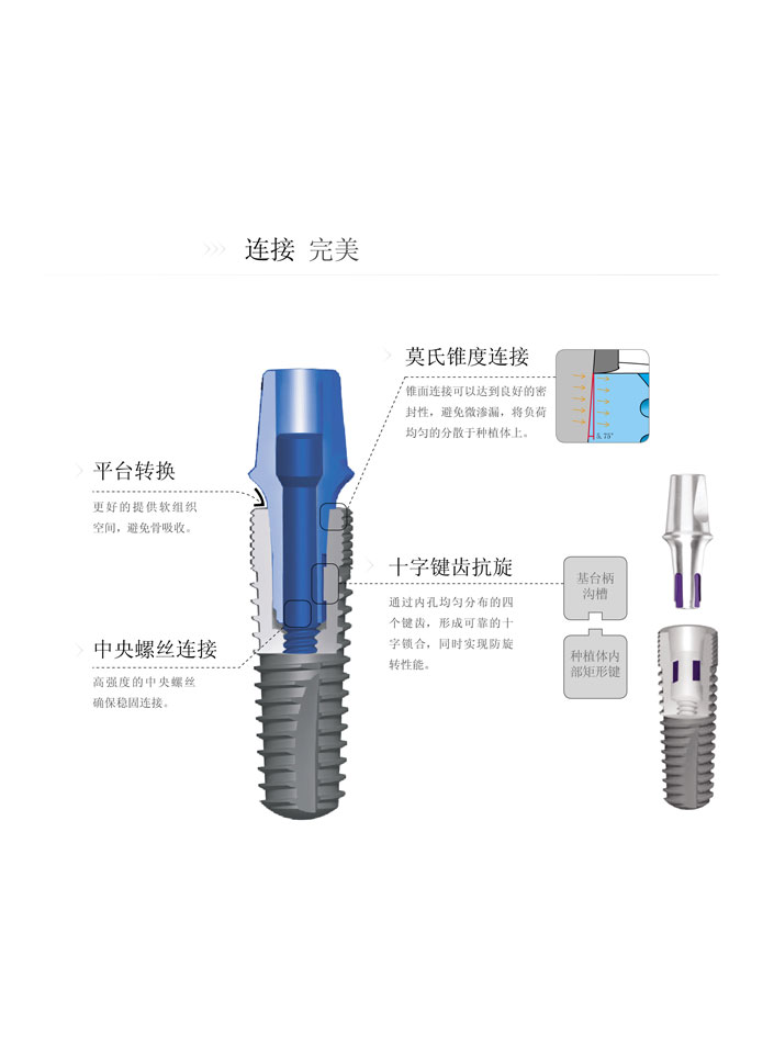 WEGO牙種植體采用了平臺轉(zhuǎn)換、莫氏錐度連接、十字鍵齒抗旋的結(jié)構(gòu)設(shè)計(jì),種植體與基臺通過高強(qiáng)度的中央螺絲穩(wěn)固連接。該結(jié)構(gòu)充分體現(xiàn)了種植體與基臺之間的無間隙密封性能、較強(qiáng)的應(yīng)力分散能力和抗旋性能。