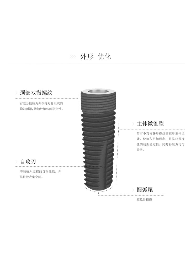 該設(shè)計較之圓柱形、單螺紋設(shè)計具有很好初期穩(wěn)定性,應(yīng)用于低密度骨質(zhì)優(yōu)越性會更加明顯。同時微錐外形和不對稱梯形主螺紋可以將牙種植體與骨周圍應(yīng)力進行有效的分散,保證生理平衡,既不會因過載荷而造成骨吸收或種植體疲勞斷裂,亦不會因作用于骨的應(yīng)力過小引起組織萎縮而產(chǎn)生骨吸收。自攻切削刃設(shè)計可方便手術(shù)時順利植入,同時增加骨結(jié)合表面積。